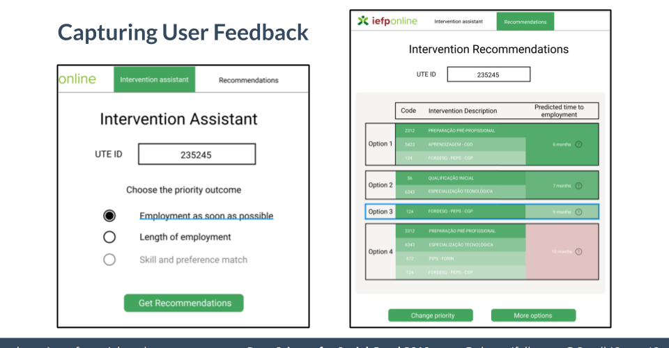 When scaled up, the individual-level benefits could have a cumulative net effect of reducing nation-wide unemployment rates in mainland Portugal. The personalised recommendations also benefit job counsellors, providing them with a more diverse but also more targeted set of interventions to be considered. This reduces the cognitive pressure during the development of the personal plan, and introduces tractability of which options have been considered during the process. Other benefits of the recommendation system include the provision of high level insights about the effectiveness of particular interventions which can enable smarter data-driven decisions on funding to be made.